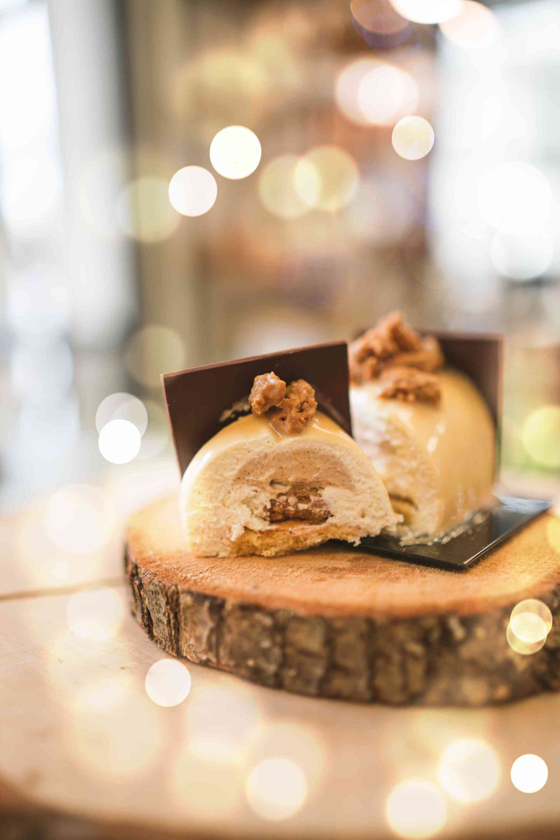 LA CHEESE CAKE ENCHANTÉE (contient du GLUTEN)* : Biscuit Cuiller, Croustillant spéculoos Dulcey, Crème brûlée spéculoos, Mousse cheese cake vanille