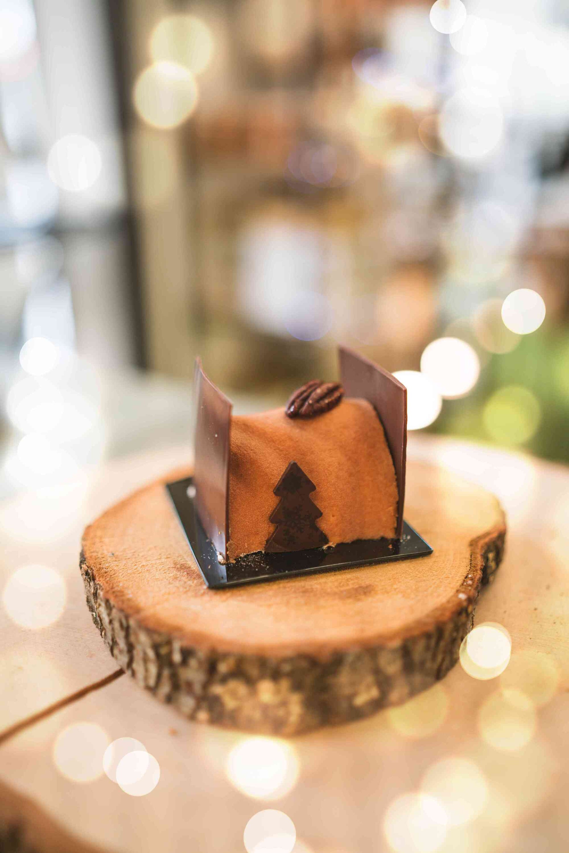 L’ANGE GOURMAND : Dacquoise amandes, Noix de Pécan caramélisées, Caramel Amatika 46%, crémeux pécan, Mousse Amatika Vanille