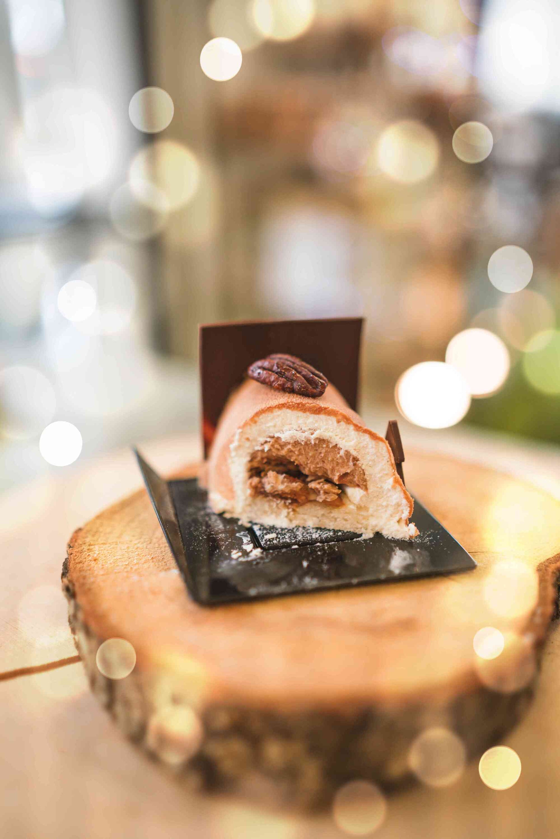 Laissez-vous envoûter par cette ode à la gourmandise céleste où le croquant d'une dacquoise aux amandes et de noix de pécan caramélisées rencontre la profondeur veloutée du caramel Amatika 46%, sublimé par un crémeux pécan généreux et une mousse Amatika vanille aérienne – une bûche divine qui honore son nom avec délice.